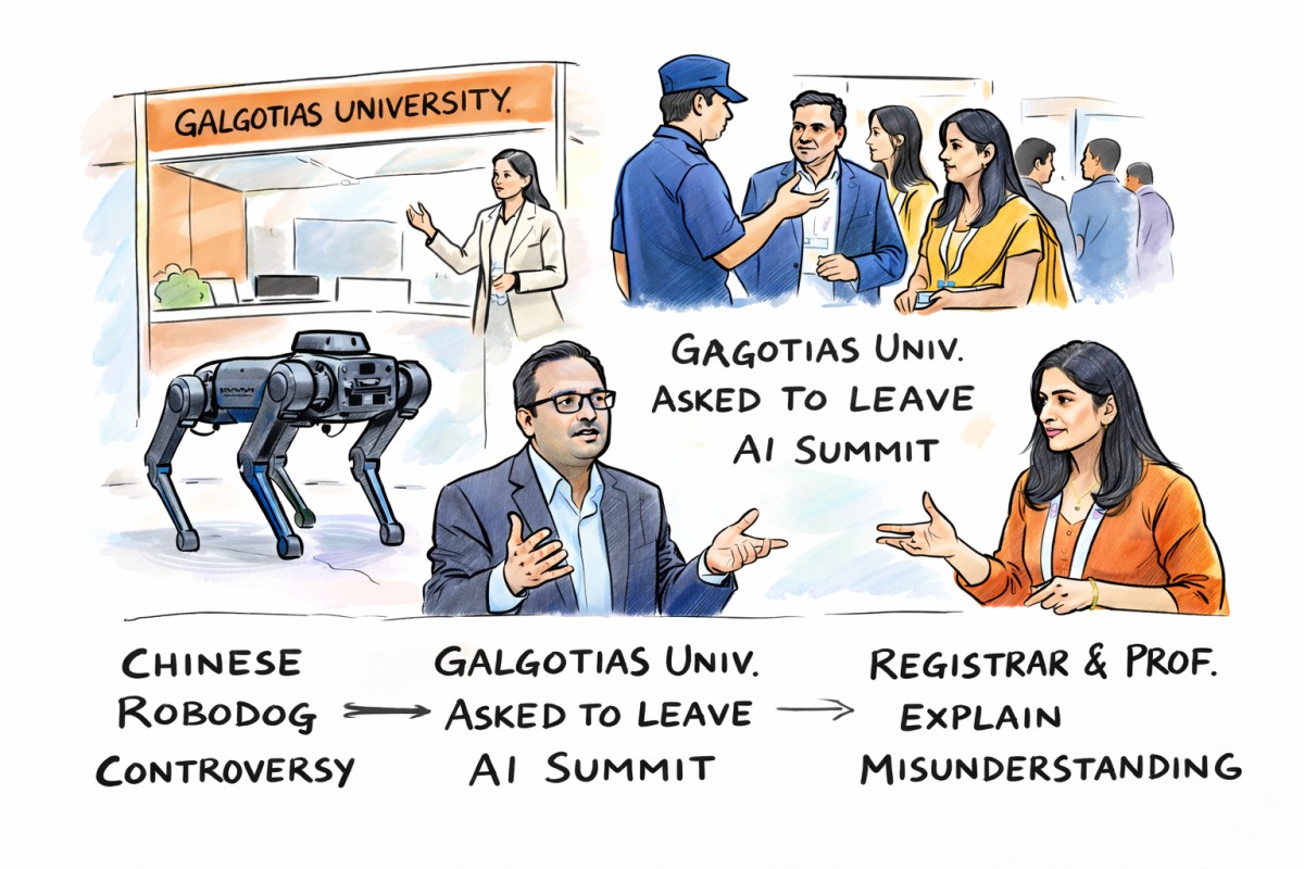 Greater Noida, February 18, 2026 — A technology showcase at the India AI Impact Summit turned contentious after Galgotias University was asked to vacate its stall following objections over the display of a Chinese‑made robotic dog.