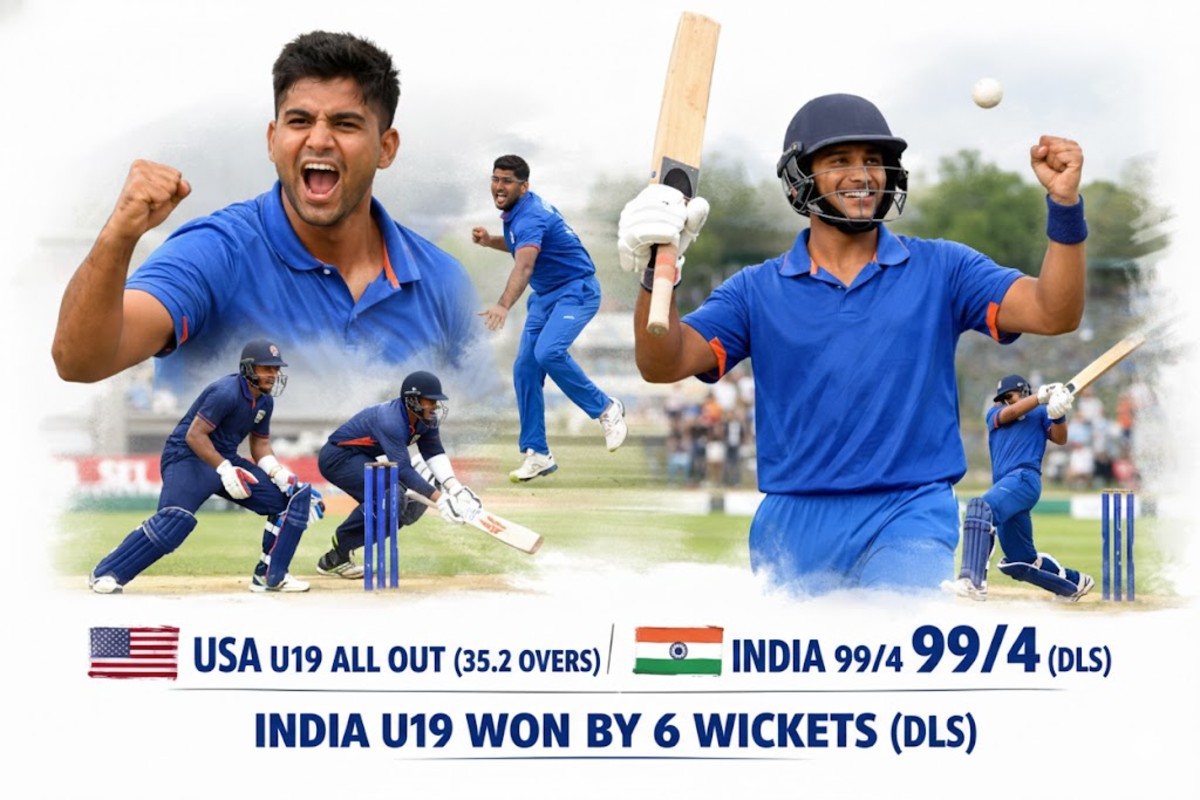 Bulawayo January 15, 2026 : Five time champions India began their ICC Under 19 World Cup 2026 campaign with a clinical six wicket victory over the USA at the Queens Sports Club in Bulawayo on Thursday, January 15, 2026. The match, which started at 1:00 PM IST, saw the Indian side overcome multiple weather interruptions and a revised target to secure full points in their Group B opener. After the American side was bundled out for a modest total, a lengthy rain delay and lightning threats forced officials to adjust the target to 96 runs from 37 overs under the DLS method, a task India completed in the 18th over.