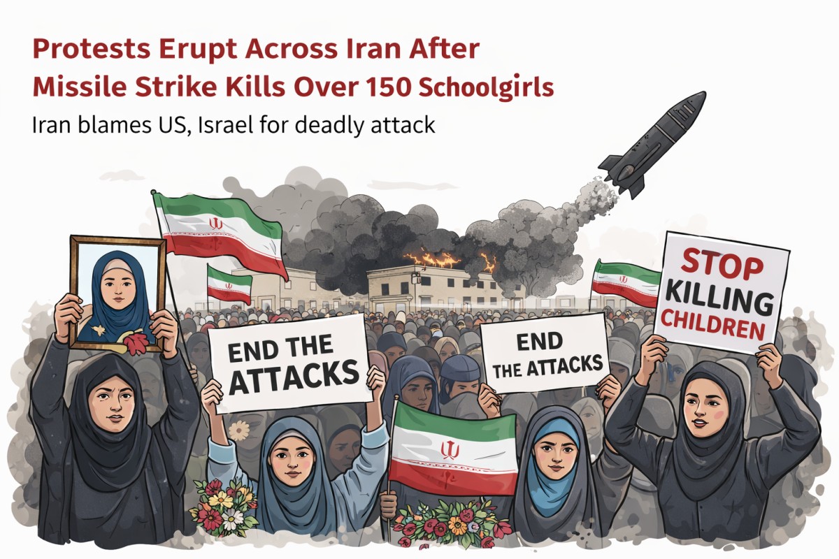Tehran, March 3, 2026 : Widespread protests broke out across Iran on Tuesday after a missile strike on an elementary school in Minab killed more than 150 schoolgirls, according to Iranian authorities. Officials in Tehran squarely blamed the United States and Israel for the attack, stating that it occurred during coordinated air and missile operations carried out over the weekend.